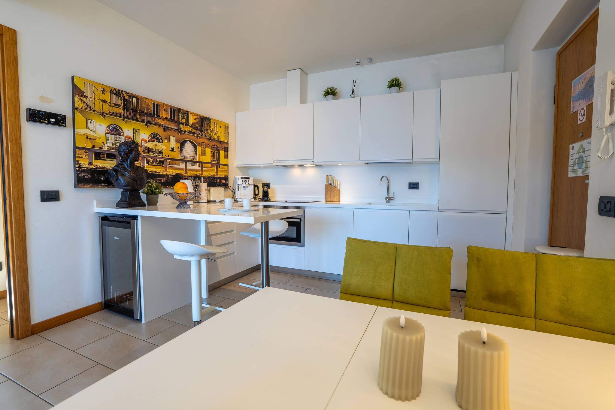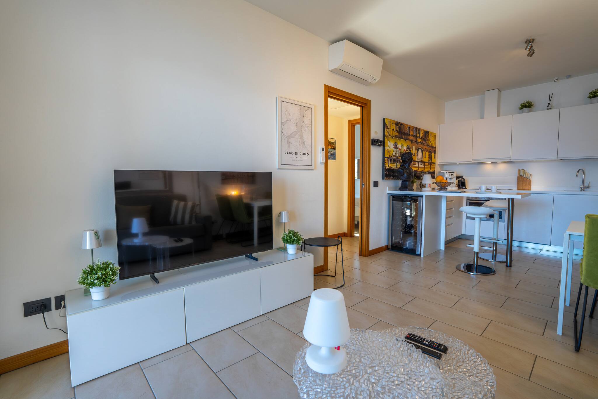 L'appartamento è caratterizzato da un arredamento moderno e curato, è composto da una cucina attrezzata e un soggiorno open space, due camere da letto matrimoniali e un bagno.