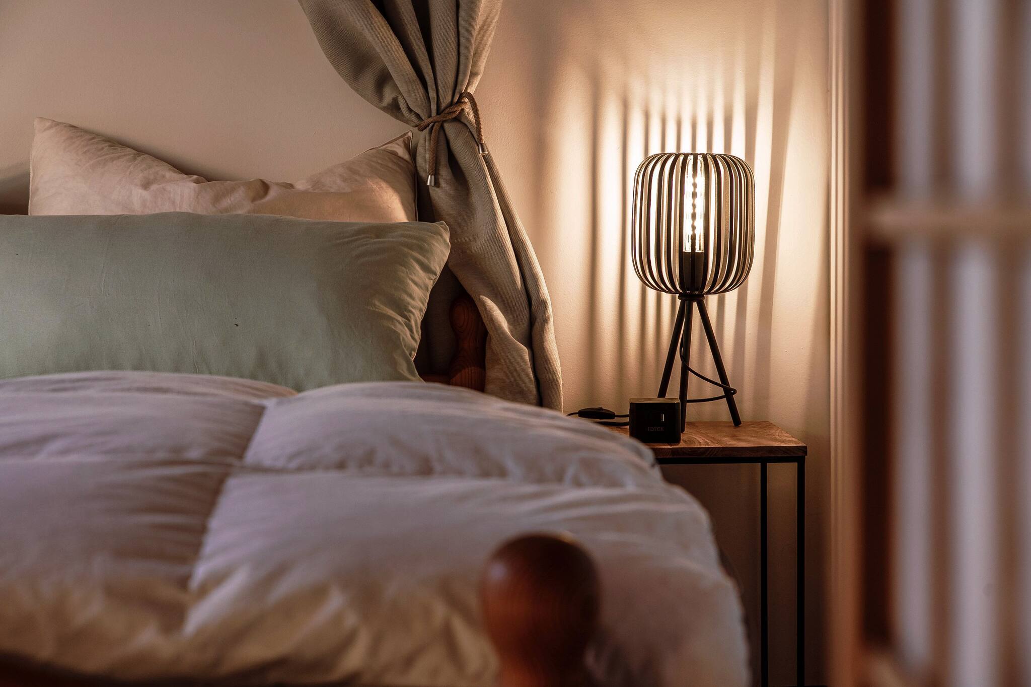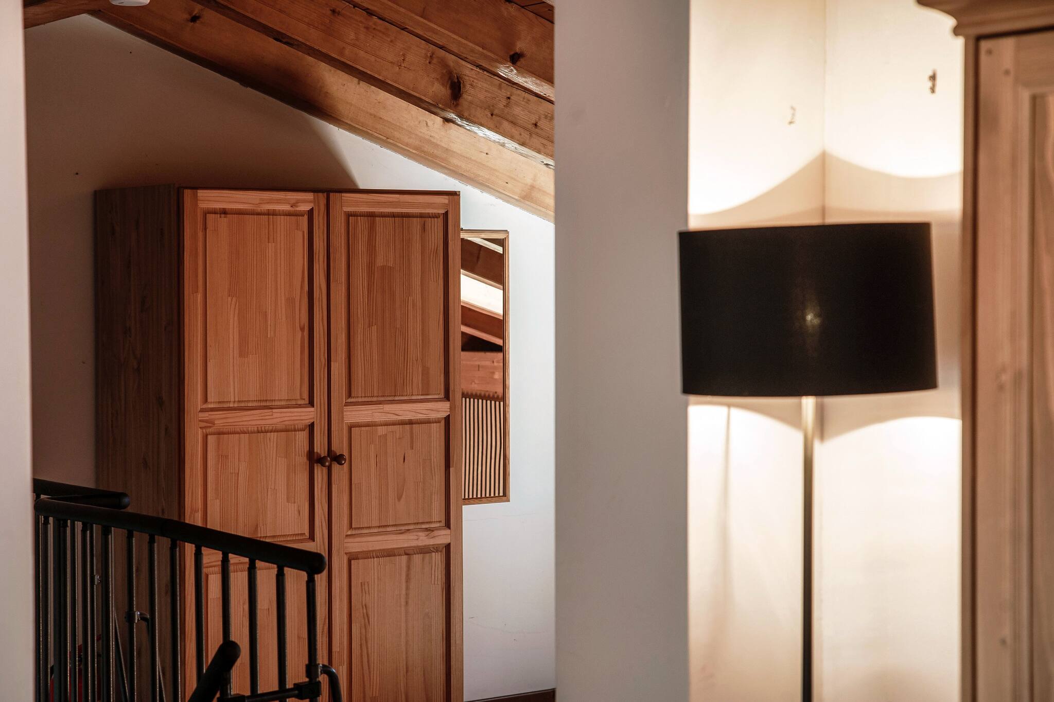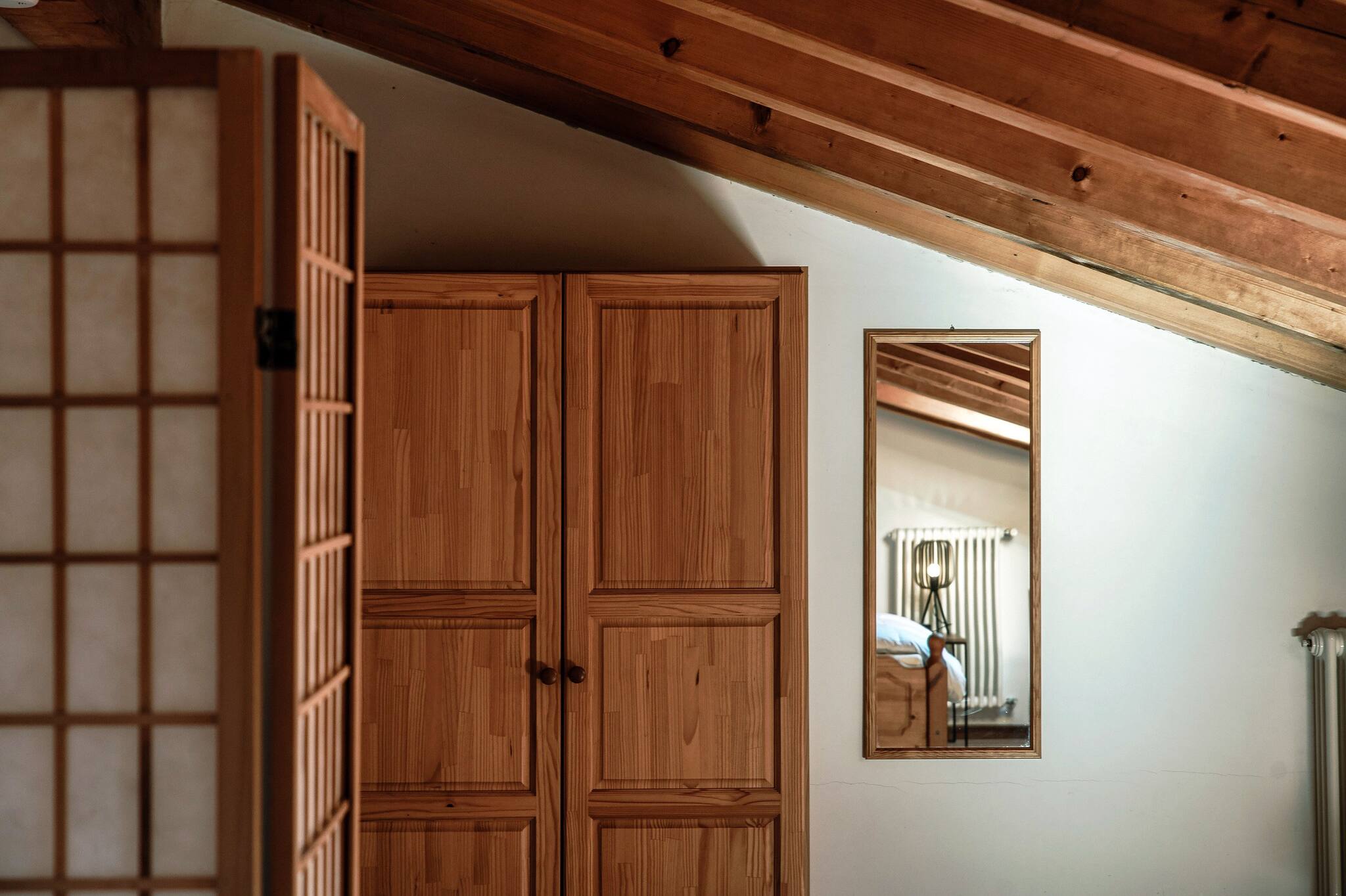 Il piano superiore dispone di due camere da letto separate da una parete ma non da una porta. Questo crea una disposizione semi-aperta, che offre sia privacy che una sensazione di luminosità e ariosità