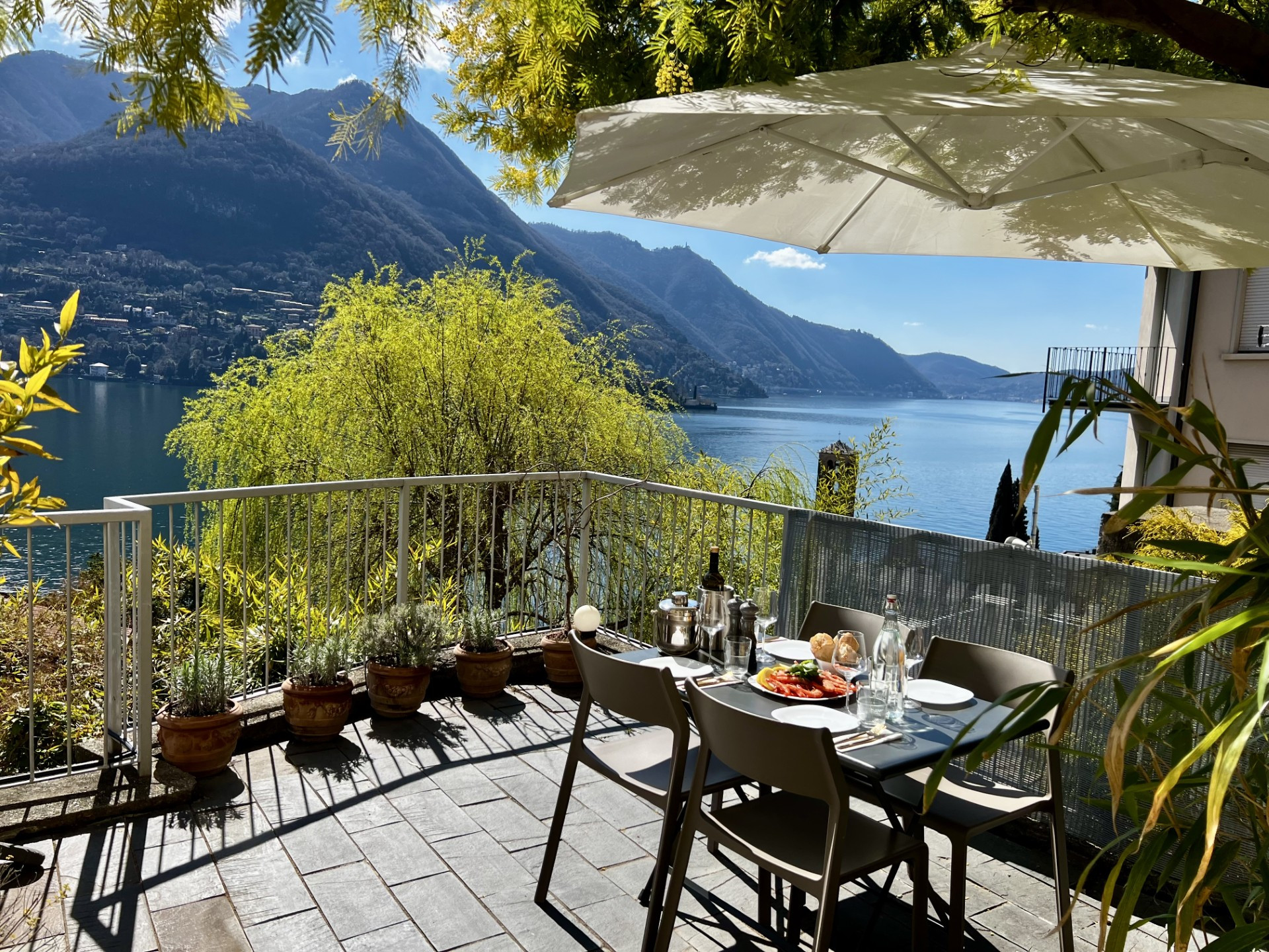 Affacciati sul tuo piccolo paradiso. Come mostrato nelle foto, il terrazzo è completamente arredato con tavolo da pranzo, sedie e lettini prendisole. Una tenda a scomparsa ti permette di scegliere tra il pieno sole mediterraneo o un'ombra fresca.
