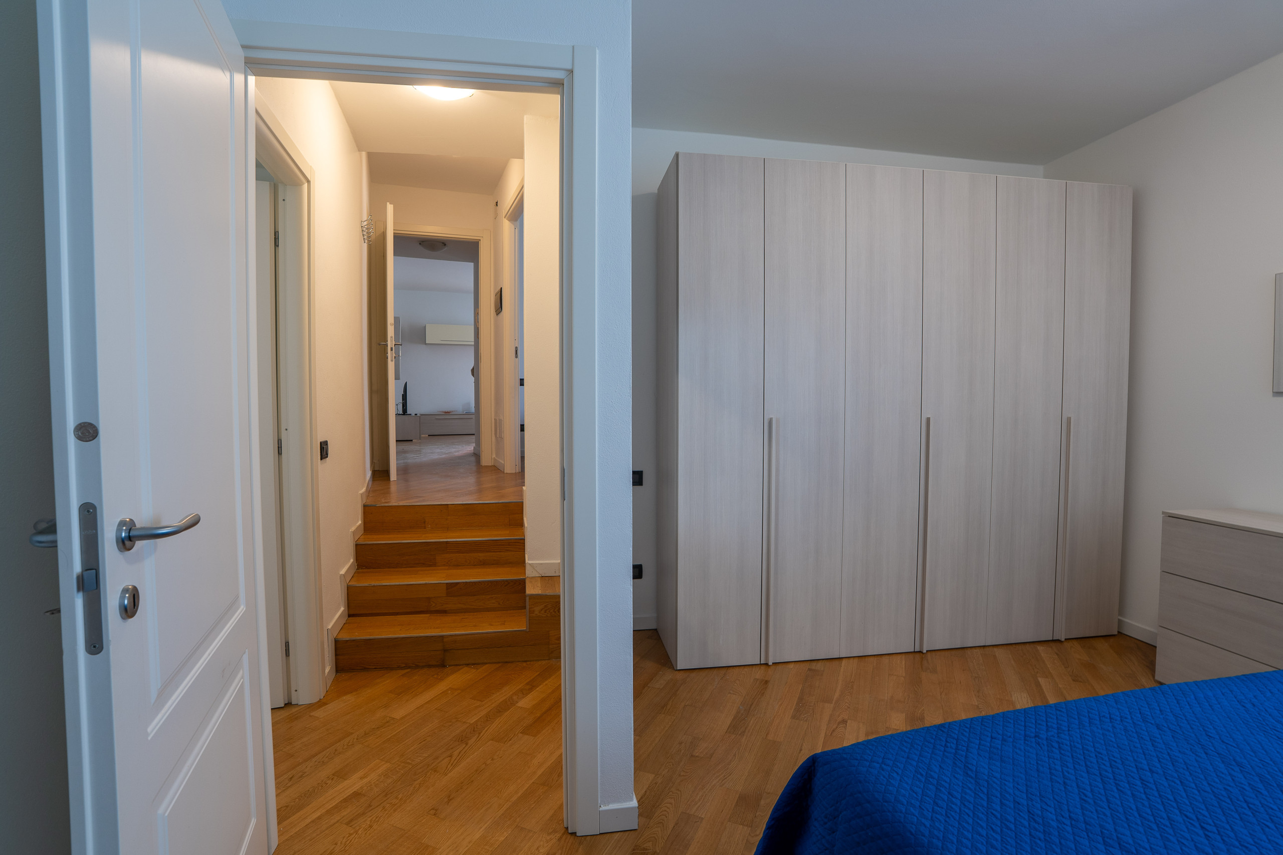 L'appartamento è costituito da due piani: al piano terra si trova una camera da letto con due letti matrimoniali e un bagno, al livello superiore abbiamo una cucina con salotto open space, una camera da letto e un bagno.