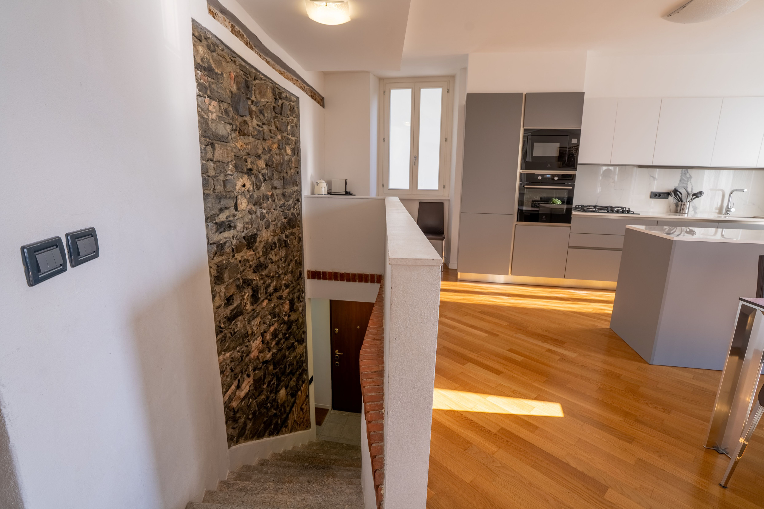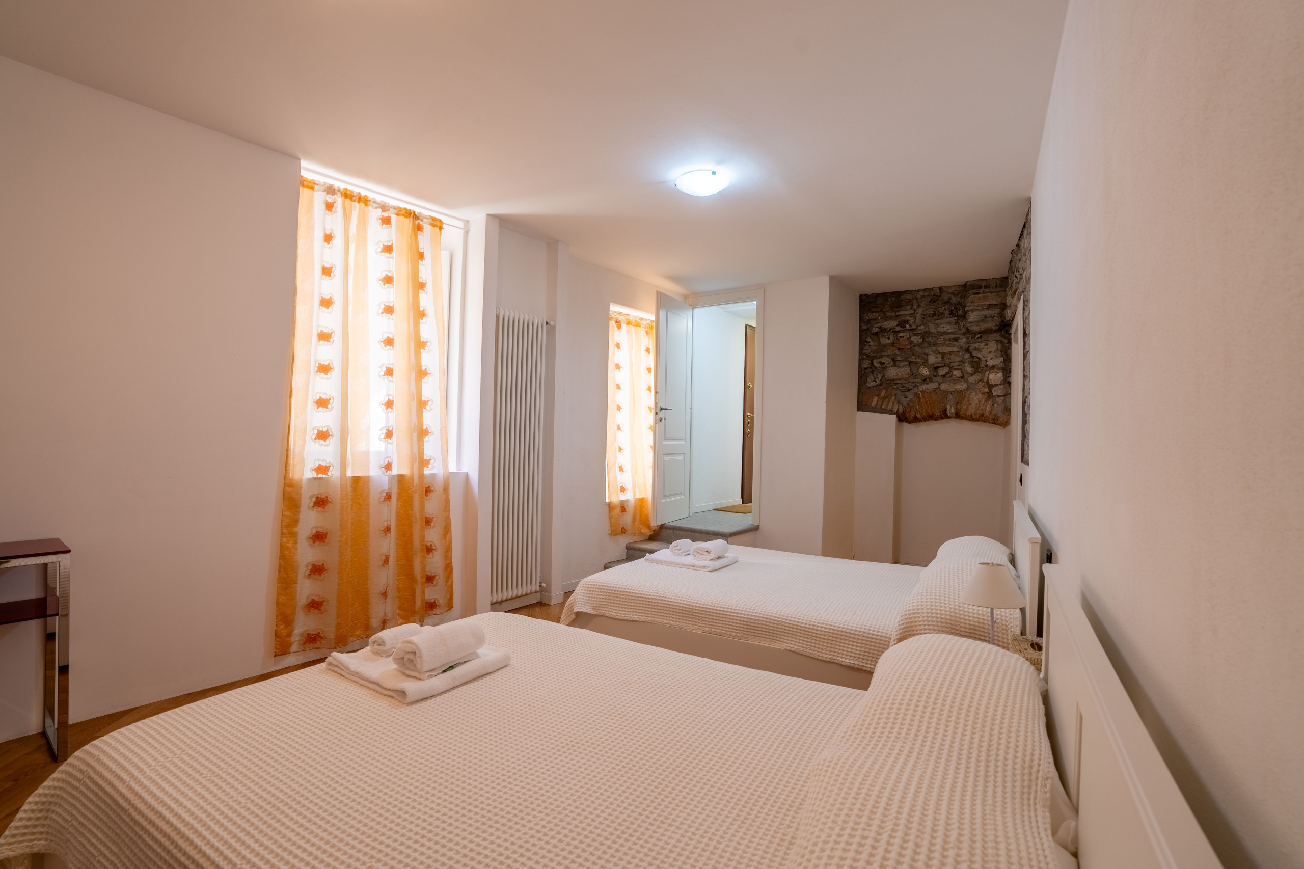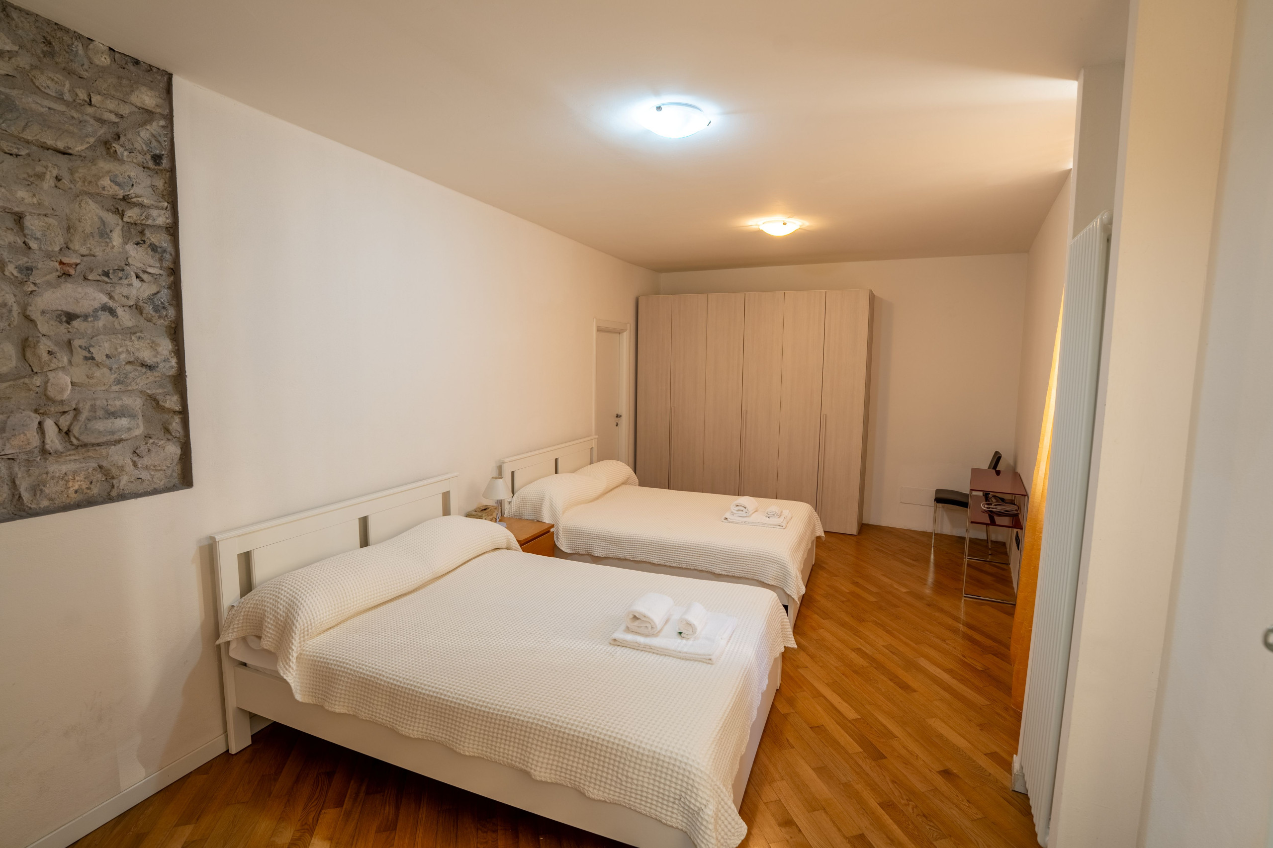 The apartment consists of two floors: on the ground floor there is a bedroom with two double beds and a bathroom, on the upper level we have an open-plan kitchen with living room, a bedroom and a bathroom.