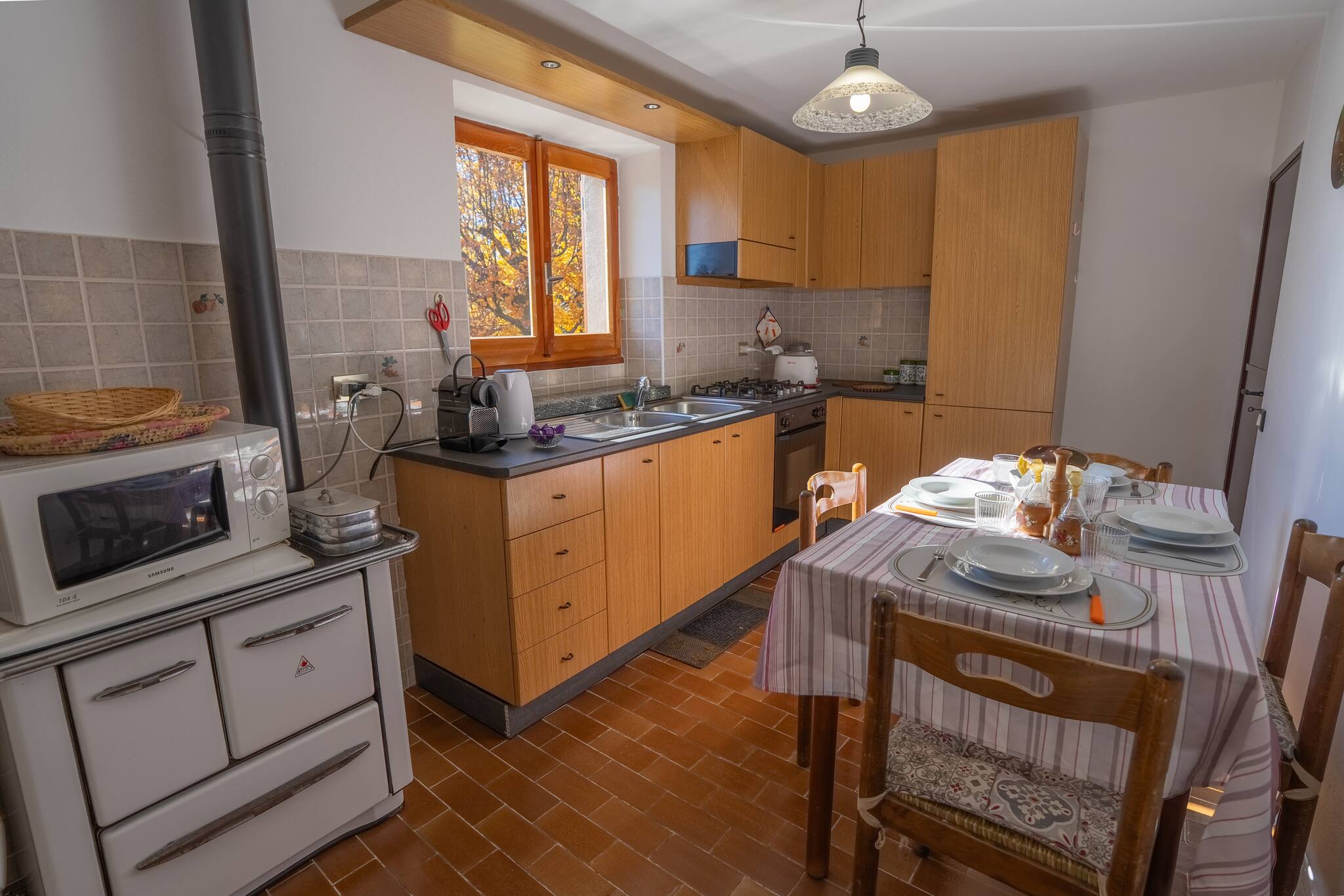 La cuisine, est équipée avec réfrigérateur, micro-ondes, four, congélateur, vaisselle/couverts, ustensiles/cuisine, cafetière, grille pain, bouilloire et cuisinière.